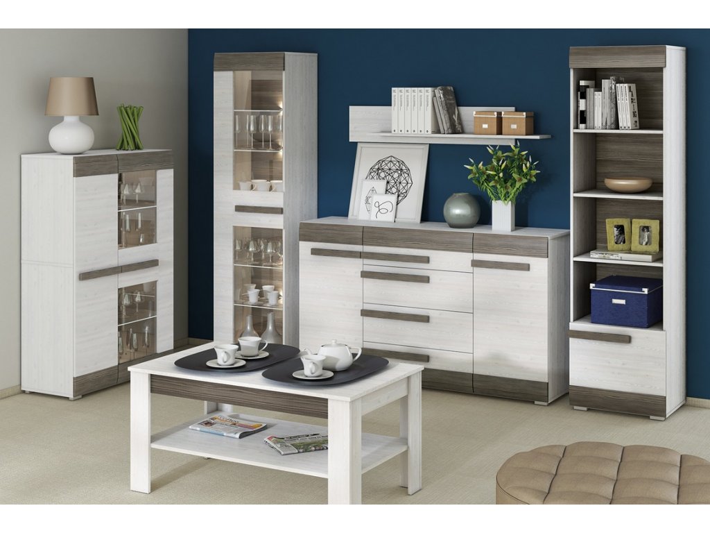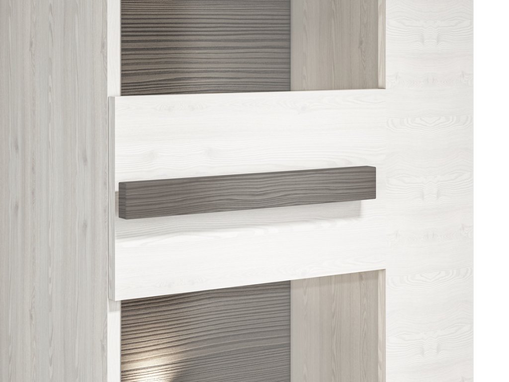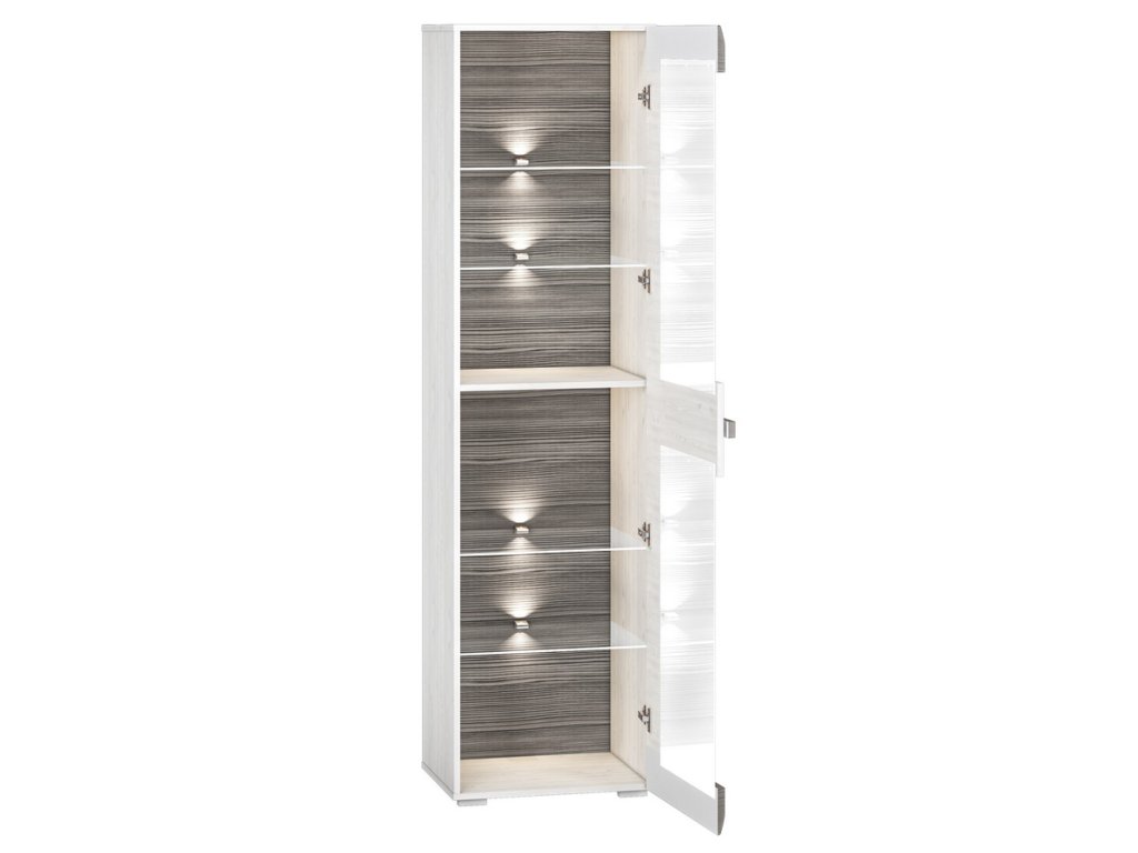 Vitrína v moderním provedení s rýhovaným dekoračním motivem v šedé barvě. Korpus a dvířka jsou vyrobeny z kvalitní desky LTD hraněné ABS páskou v barvě borovice sněžná, dekorační motivy a úchyty jsou vyrobeny z desky MDF v barvě šedá. Dvířka je možné namontovat na pravou nebo levou stranu. Možnost dokoupení LED osvětlení. Dodáváme v demontovaném stavu.