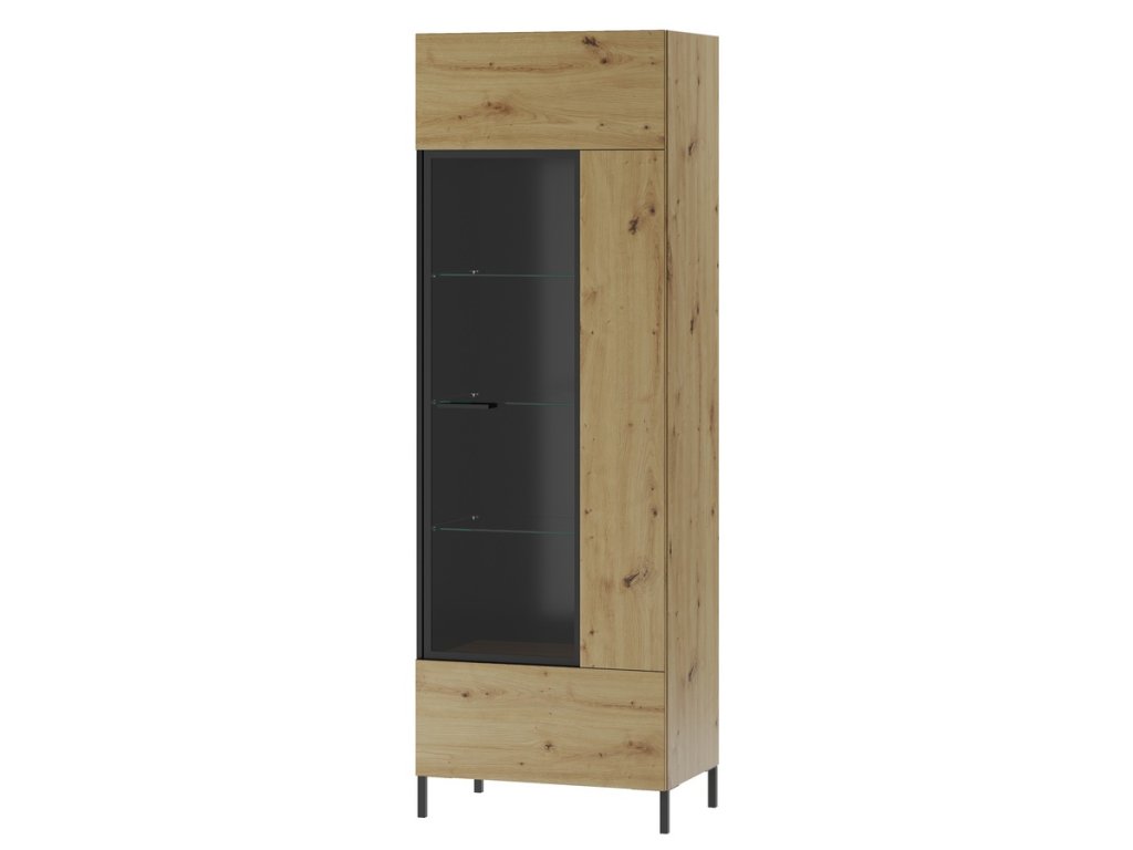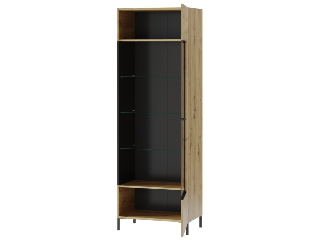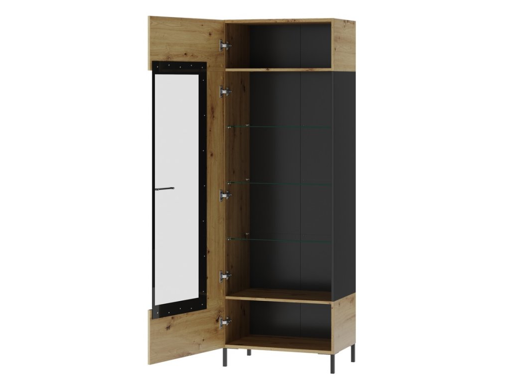 Vitrína jednodveřová. Korpus i dvířka jsou z kvalitní desky LTD v barvě dub artisan/černá mat, dvířka z tvrzeného skla jsou usazené v černém kovovém rámu. Dvířka je možné namontovat na pravou nebo levou stranu. K vitríně můžete dokoupit také LED osvětlení. Úchyty jsou z plastu v černé barvě, nožky jsou kovové černé. Dodáváme v demontovaném stavu.