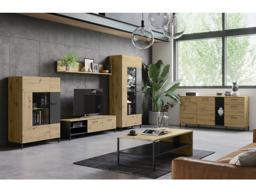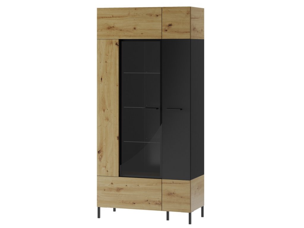 Vitrína dvoudveřová. Korpus i dvířka jsou z kvalitní LTD v barvě dub artisan/černá mat, dvířka z tvrzeného skla jsou usazené v černém kovovém rámu. K vitríně můžete dokoupit také LED osvětlení. Úchyty jsou z plastu v černé barvě, nožky jsou kovové černé. Dodáváme v demontovaném stavu.