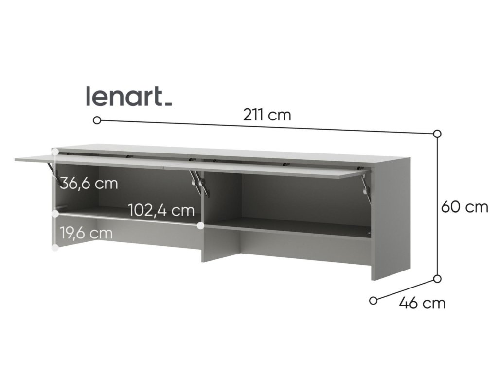 Nádstavec k výklopné posteli široká 140 šedá. Nádstavec má 2 dvířka. Rozměry viz obrázek. Nábytek je vyroben z kvalitního lamina s ABS hranou. Lamino je odolné proti poškrábání, poškození, vlhkosti a vysokým teplotám. Dodáváme v demontovaném stavu.Doplňkové parametry