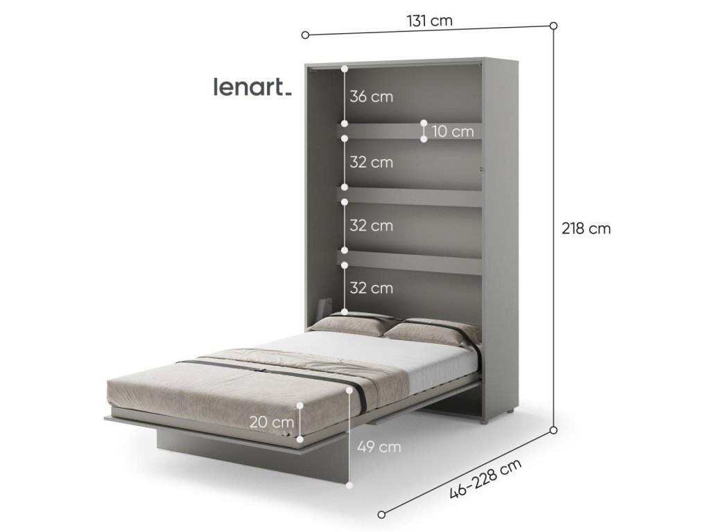 Vysoká výklopná postel 120 šedá mat. Rozměry viz obrázek. Se sklápěcí postelí Vás už nebude trápit malý prostor Vaší domácnosti. Díky stabilní konstrukci zaručuje pohodlný odpočinek. Pneumatický mechanismus sklápění postele zajistí bezpečné otevírání a je doplněn SOFT CLOSE systémem tichého zavírání. Tento výjimečný systém Vám umožní manipulaci pouze jedním prstem. Když je postel sklopená, vypadá jako běžná skříň. Vyklopením se vytáhne celá délka postele. Při lozložení postele má hloubku 228 cm. Uvnitř skříně jsou praktické police na knížky nebo dekorační předměty, vše máte na dosah ruky. Maximální zatížení polic je 5 kg. Rám je nutno přišroubovat ke zdi, nosnost postele je 150 kg. Rošt postele je v ceně, matrace není součástí, je potřeba ji dokoupit. Doporučujeme velikost 120 x 200 x výšku do 18 cm. Po sklopení postele vzniká prostor pod postelí o výšce 24,9 cm. Nábytek je vyroben z kvalitního lamina s ABS hranou. Lamino je odolné proti poškrábání, poškození, vlhkosti a vysokým teplotám. Postel nabízíme v několika velikostech a barevných provedeních. K posteli je možné dokoupit LED osvětlení. Dodáváme v demontovaném stavu. Můžete si prohlédnout prezentační video, klikněte ZDE.Doplňkové parametry