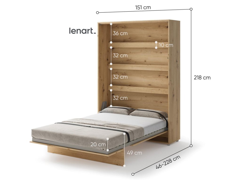 Vysoká výklopná postel 140 dub artisan. Rozměry viz obrázek. Se sklápěcí postelí Vás už nebude trápit malý prostor Vaší domácnosti. Díky stabilní konstrukci zaručuje pohodlný odpočinek. Pneumatický mechanismus sklápění postele zajistí bezpečné otevírání a je doplněn SOFT CLOSE systémem tichého zavírání. Tento výjimečný systém Vám umožní manipulaci pouze jedním prstem. Když je postel sklopená, vypadá jako běžná skříň. Vyklopením se vytáhne celá délka postele. Při lozložení postele má hloubku 228 cm. Uvnitř skříně jsou praktické police na knížky nebo dekorační předměty, vše máte na dosah ruky. Maximální zatížení polic je 5 kg. Rám je nutno přišroubovat ke zdi, nosnost postele je 200 kg. Rošt postele je v ceně, matrace není součástí, je potřeba ji dokoupit. Doporučujeme velikost 140 x 200 x výšku do 18 cm. Po sklopení postele vzniká prostor pod postelí o výšce 24,9 cm. Nábytek je vyroben z kvalitního lamina s ABS hranou. Lamino je odolné proti poškrábání, poškození, vlhkosti a vysokým teplotám. Postel nabízíme v několika velikostech a barevných provedeních. K posteli je možné dokoupit LED osvětlení. Dodáváme v demontovaném stavu. Můžete si prohlédnout prezentační video, klikněte ZDE.Doplňkové parametry