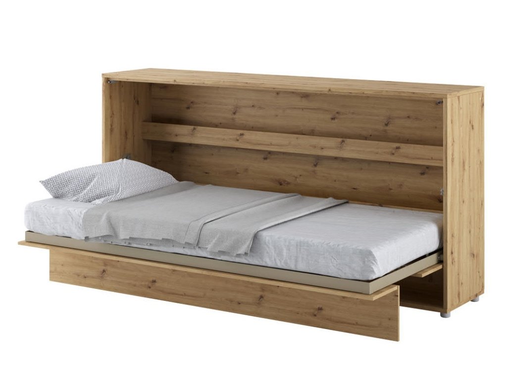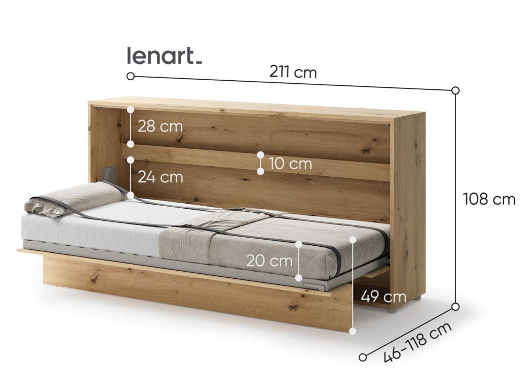 Široká výklopná postel 90 dub artisan. Rozměry viz obrázek. Se sklápěcí postelí Vás už nebude trápit malý prostor Vaší domácnosti. Díky stabilní konstrukci zaručuje pohodlný odpočinek. Pneumatický mechanismus sklápění postele zajistí bezpečné otevírání a je doplněn SOFT CLOSE systémem tichého zavírání. Tento výjimečný systém Vám umožní manipulaci pouze jedním prstem. Když je postel sklopená, vypadá jako běžná skříň. Vyklopením se vytáhne celá šířka postele. Při lozložení postele má hloubku 118 cm. Uvnitř skříně jsou praktické police na knížky nebo dekorační předměty, vše máte na dosah ruky. Maximální zatížení polic je 5 kg. Rám je nutno přišroubovat ke zdi, nosnost postele je 100 kg. Rošt postele je v ceně, matrace není součástí, je potřeba ji dokoupit. Doporučujeme velikost 90 x 200 x výšku do 18 cm. Po sklopení postele vzniká prostor pod postelí o výšce 24,9 cm. Nábytek je vyroben z kvalitního lamina s ABS hranou. Lamino je odolné proti poškrábání, poškození, vlhkosti a vysokým teplotám. Postel nabízíme v několika velikostech a barevných provedeních. K posteli je možné dokoupit LED osvětlení. Dodáváme v demontovaném stavu. Můžete si prohlédnout prezentační video, klikněte ZDE.Doplňkové parametry