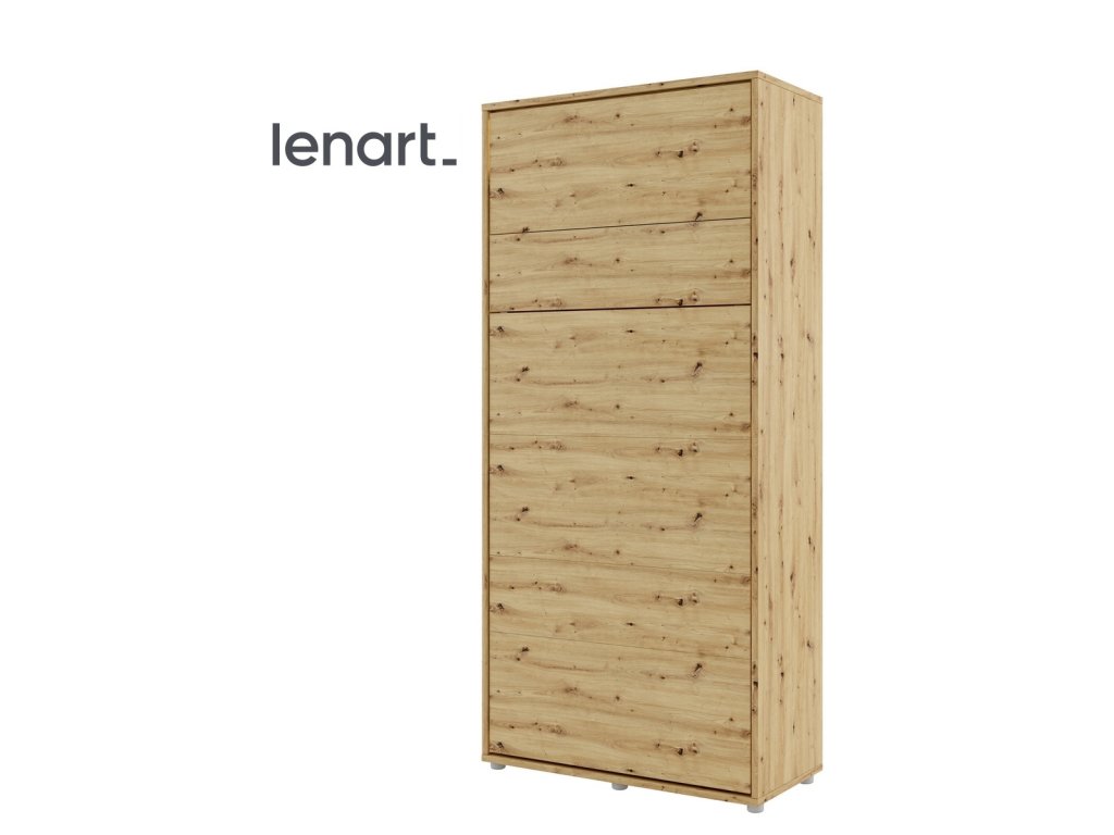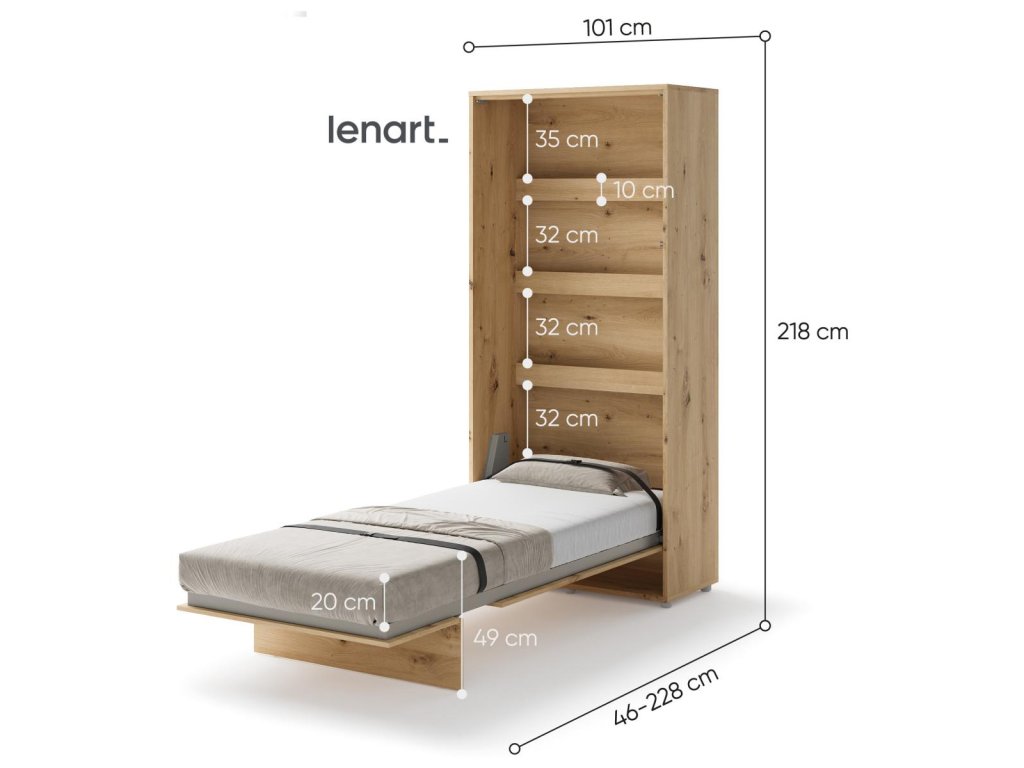 Vysoká výklopná postel 90 dub artisan. Rozměry viz obrázek. Se sklápěcí postelí Vás už nebude trápit malý prostor Vaší domácnosti. Díky stabilní konstrukci zaručuje pohodlný odpočinek. Pneumatický mechanismus sklápění postele zajistí bezpečné otevírání a je doplněn SOFT CLOSE systémem tichého zavírání. Tento výjimečný systém Vám umožní manipulaci pouze jedním prstem. Když je postel sklopená, vypadá jako běžná skříň. Vyklopením se vytáhne celá délka postele. Při lozložení postele má hloubku 226 cm. Uvnitř skříně jsou praktické police na knížky nebo dekorační předměty, vše máte na dosah ruky. Maximální zatížení polic je 5 kg. Rám je nutno přišroubovat ke zdi, nosnost postele je 100 kg. Rošt postele je v ceně, matrace není součástí, je potřeba ji dokoupit. Doporučujeme velikost 90 x 200 x výšku do 18 cm. Po sklopení postele vzniká prostor pod postelí o výšce 24,9 cm. Nábytek je vyroben z kvalitního lamina s ABS hranou. Lamino je odolné proti poškrábání, poškození, vlhkosti a vysokým teplotám. Postel nabízíme v několika velikostech a barevných provedeních. K posteli je možné dokoupit LED osvětlení. Dodáváme v demontovaném stavu. Můžete si prohlédnout prezentační video, klikněte ZDE.Doplňkové parametry