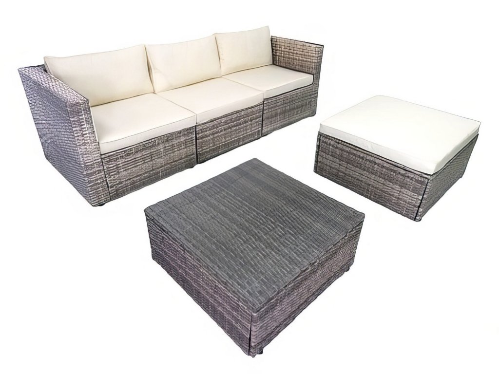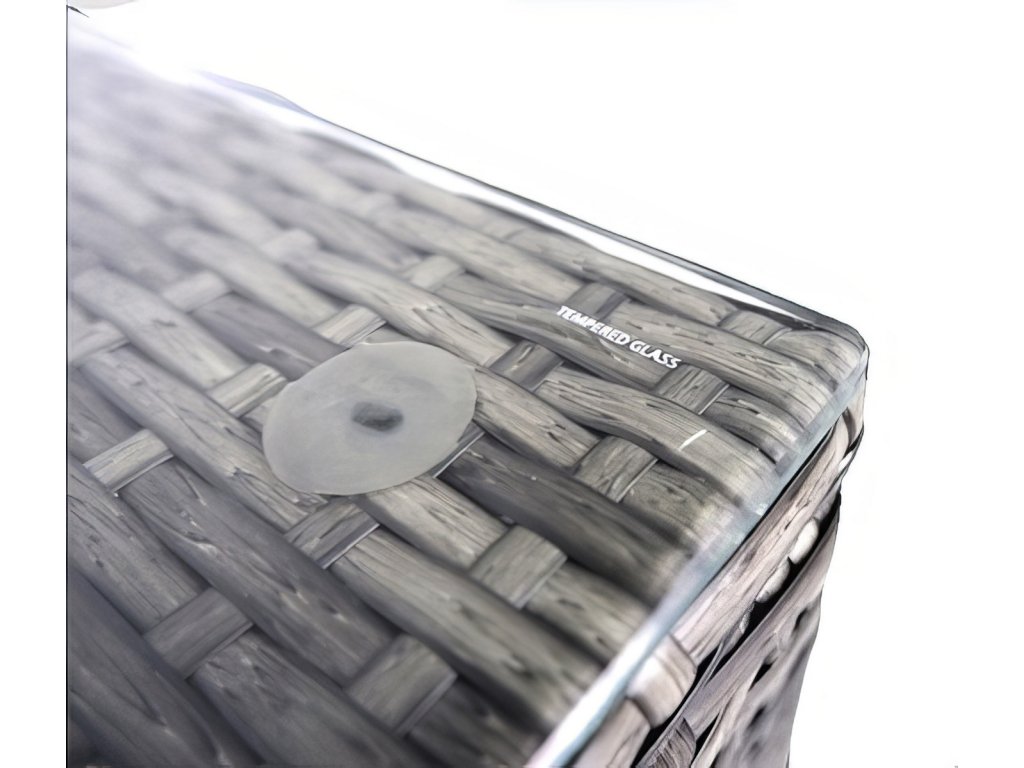 Zahradní sestava rohové sedačky a 1 stolu z umělého ratanu. Díky volbě materiálu je sedačka lehce omyvatelná a údržba není nijak náročná. Konstrukce je kovová obalená kvalitním plastem připomínající ratan. Sedačka se skládá z pohovky a taburetu, který vytvoří při přidání rohovou sedačku. Dodáváme včetně čalouněných sedáků a opěrek v barvě bílý krém, tl. 12 cm a 7 cm. Rozměr taburetu je (Š x V x H cm) 70 x 30 (+ sedák) x 70 cm. Výška sedu je tedy cca 42 cm. Rozměr rohové sedačky po přidání taburetu je ( Š x V x H cm) - 200 x 60 x 140 cm (hloubka pohovky je 70 cm). Barevné provedení - šedá. Konferenční stolek s čirým tvrzeným sklem na přísavkách o rozměrech (Š x V x H cm) 65 x 30 (+sklo) x 65 cm je součástí sestavy. Dodáváme v demontovaném stavu.Doplňkové parametry