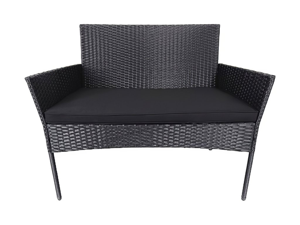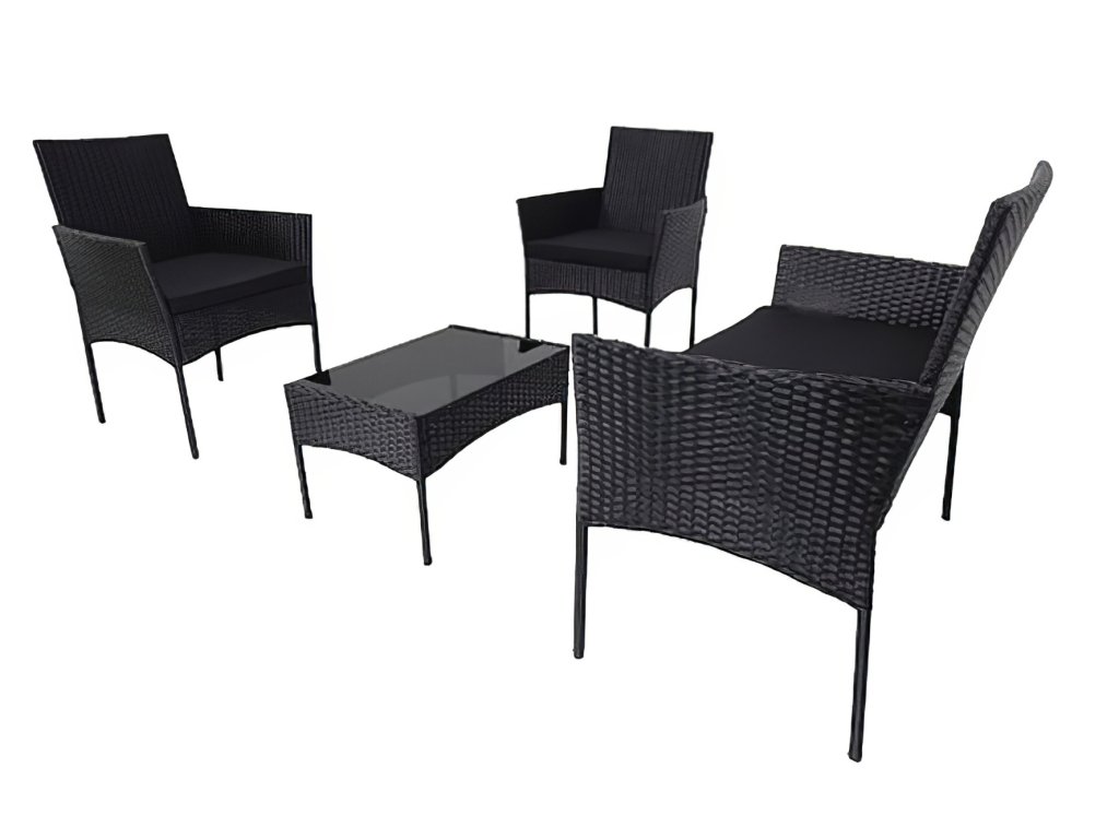 Zahradní sestava 1 dvojsedáku, 2 křesel a 1 stolu z umělého ratanu. Díky volbě materiálu jsou křesla lehce omyvatelná a údržba není nijak náročná. Dodáváme včetně sedáků v barvě černé, výška 5 cm. Konstrukce je kovová obalená kvalitním plastem připomínající ratan. Rozměr dvojsedáku je (Š x V x H cm) - 100 x 84 x 57 cm a rozměr křesla je (Š x V x H cm) - 57 x 84 x 57 cm. Výška sedu se sedákem je cca 46 cm. Konferenční stolek s černým tvrzeným sklem o rozměrech (Š x V x H cm) 60 x 35 x 40 cm je součástí sestavy. Barevné provedení - černá. Dodáváme v demontovaném stavu.Doplňkové parametry