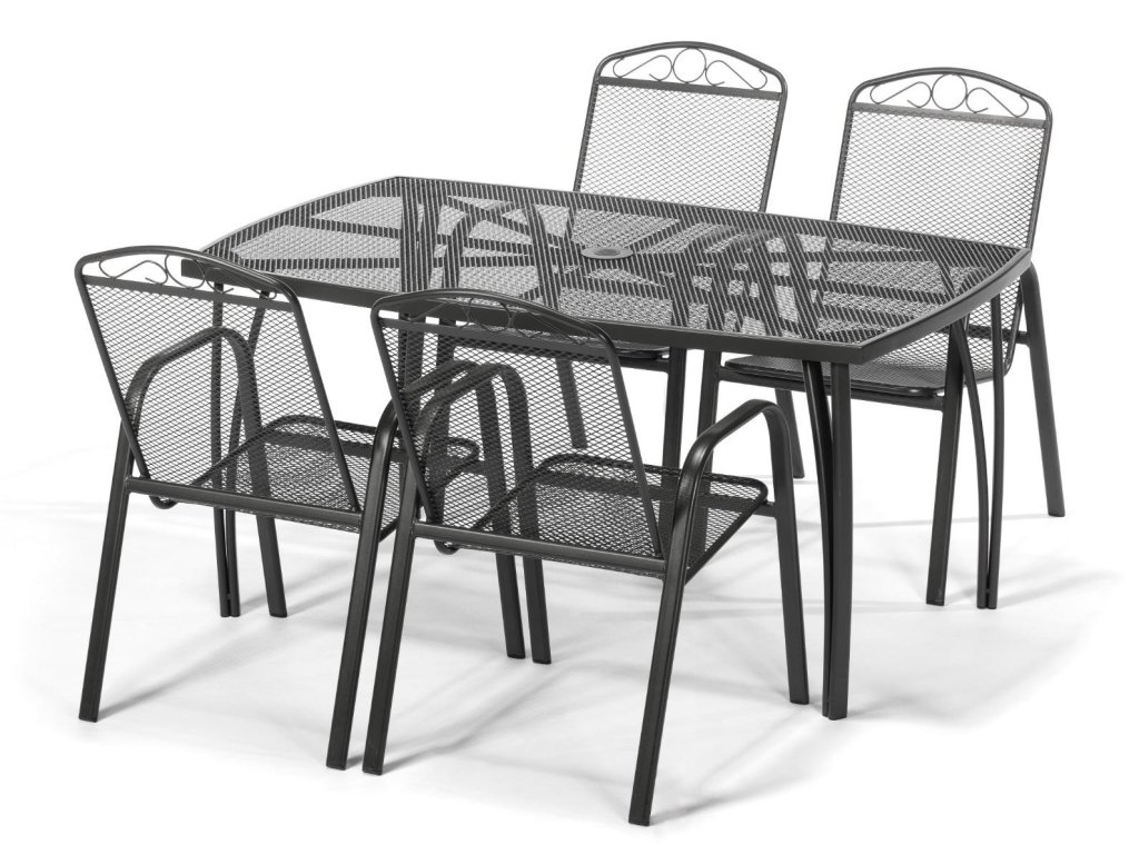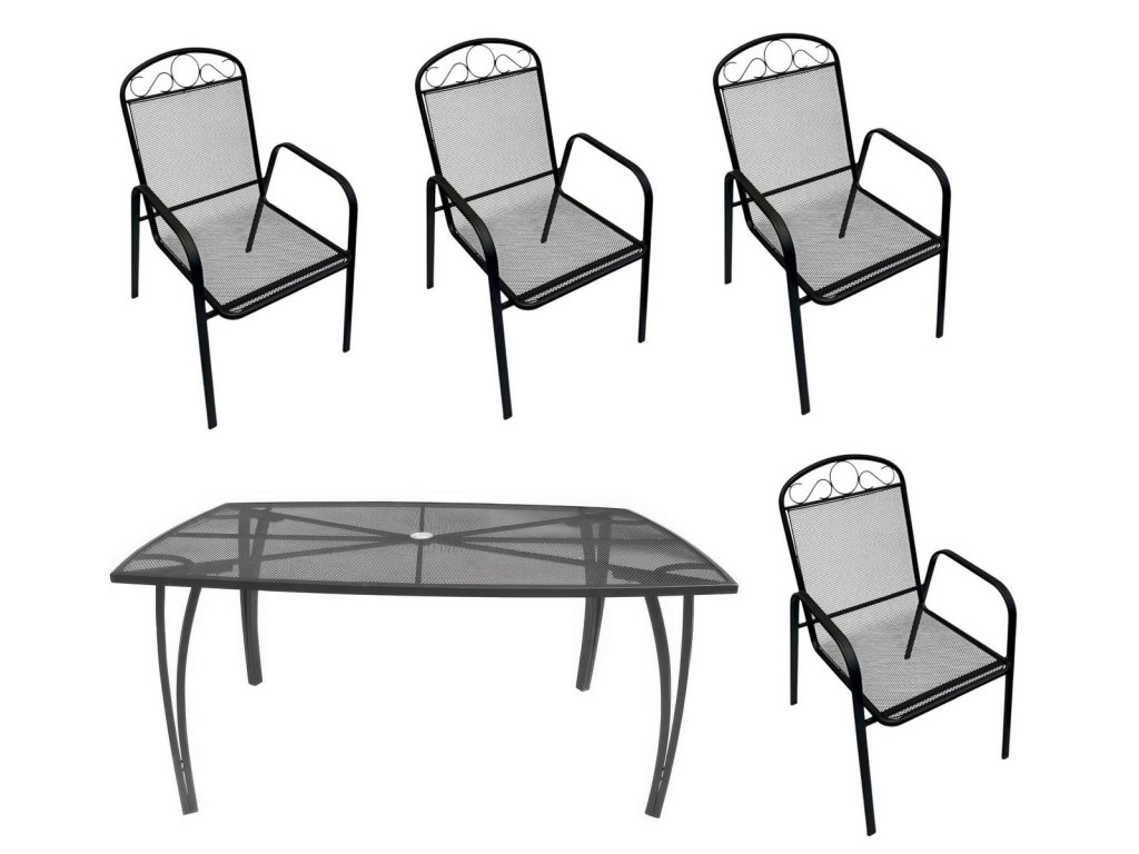 Zahradní kovová sestava se skládá z těchto komponentů, rozměry ( Š x V x H cm): 4x křeslo - ( 57 x 94 x 69 cm ) a stůl - ( 90 x 71 x 150 cm). Výška sedu křesla je cca 43 cm. Díky použitým materiálům není údržba sestavy nijak náročná. Barevné provedení - černá. Jednotlivé díly lze zakoupit zvlášť.Doplňkové parametry