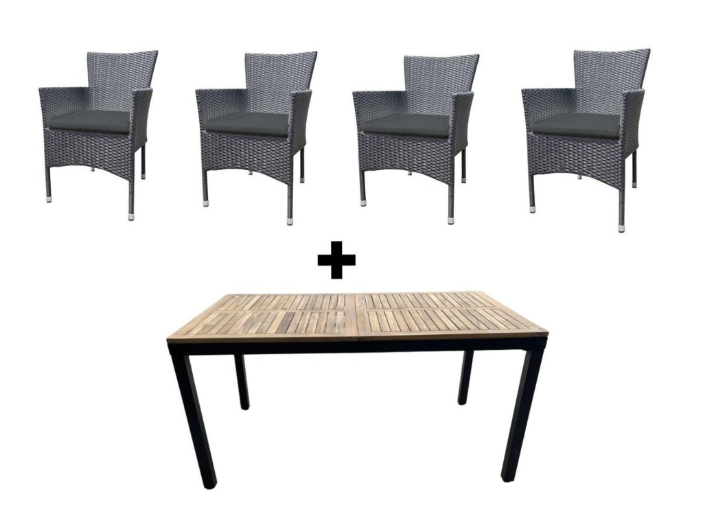 Stylová zahradní sestava se skvěle hodí na balkon, terasu i zahradu. Deska stolu je vyrobena z kvalitního masivního dřeva akácie. Přírodní dřevěný dekor vrchní desky v kombinaci s černou kovovou konstrukcí tvoří výjimečný designový prvek vaší zahrady nebo terasy. Díky poctivému materiálu je stůl mimořádně odolný. Konstrukce křesel je vyrobena z kovu, barevné provedení umělého ratanu je černý antracit. Použití hliníkové konstrukce pro zahradní nábytek, který musí odolávat zvýšené vlhkosti, je tou správnou volbou. Hliník je lehký a nerezaví – s takovou konstrukcí tedy budete bez starostí. Čalouněné sedáky křesel v antracitové barvě jsou snímatelné, pratelné a mají výšku 3 cm. Rozměry křesla (v/š/h): 87 × 67 × 52 cm. Výška sedu: 42 cm, šířka sedu: 46 cm. Rozměry stolu (š/v/h): 150 × 74 × 90 cm. Dodáváme v demontovaném stavu. Péče o zahradní nábytek z masivu: Používejte ubrus a podložky, abyste předešli vzniku skvrn. Nepoužívejte abrazivní prostředky jako aceton, bělidlo, rozpouštědla apod. Ostré předměty mohou poškodit povrch. Čistěte vlhkým hadříkem namočeným v jemném mýdlovém roztoku a ihned osušte suchým hadříkem. Mimo sezónu skladujte na suchém krytém místě. Pokud jej necháte venku, chraňte jej na podzim, v zimě a během dešťů nepromokavým krytem.Doplňkové parametry