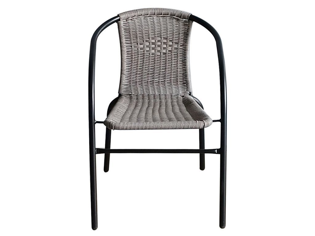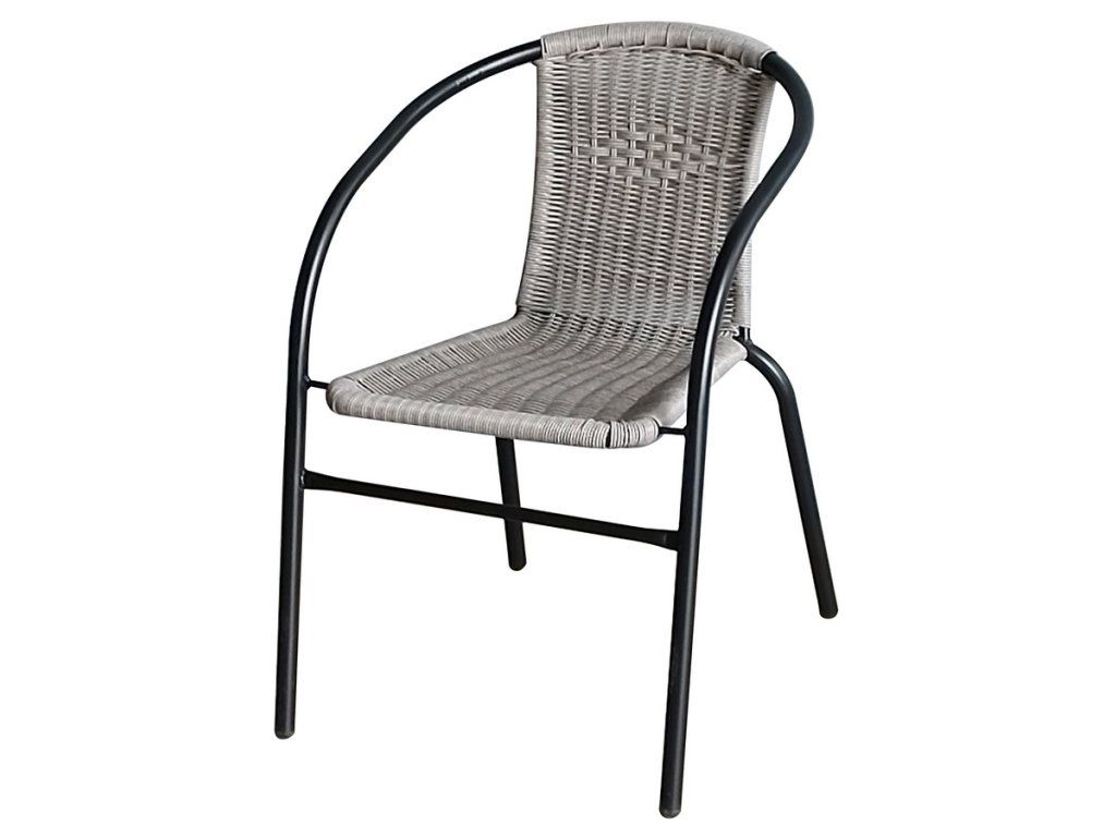Balkonová židle. Díky volbě materiálu je lehce omyvatelná a její údržba není nijak náročná. Křeslo je z ocelové konstrukce černé barvy, sedák je z umělého ratanu šedé barvy. Výška sedu křesla je 42 cm, hloubka sedu je 39 cm.